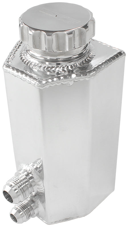 Aeroflow's Fabricated Universal Power Steering Tanks come with our Billet 38.1mm (1-1/2") I.D cap and holds 660ml (22.5oz) of fluid. These professionally constructed tanks are available polished or anodised black finishes. The internal construction features a smart design baffle to prevent aeration. Fabricated from 5051 aluminium and incorporate -8AN and -10AN male fittings. Tank overall height is 190mm (7-1/2") and width is 80mm (3-1/8"). Fitted with 2 x M8 x 1.25 female mounting bungs and mounting hardware.