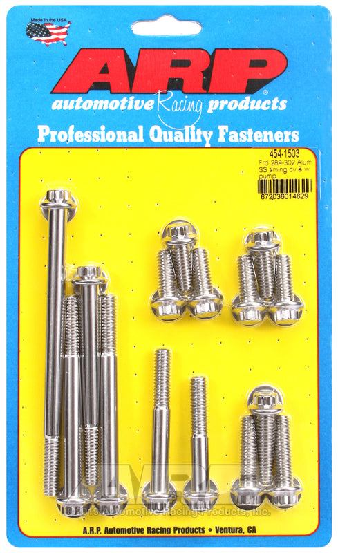 ARP TIMING COVER & WATER PUMP BOLT KIT FORD SB 289-302 CID ARP 454-1503Securing your timing cover is easier than ever with ARP's timing cover bolt kits. You can choose between polished stainless steel and chromoly black oxide finishes. They're also available in your choice of standard hex or compact 12-point style heads. Washers are included.Specs:Application: Ford SB 289-302 C.I..D.