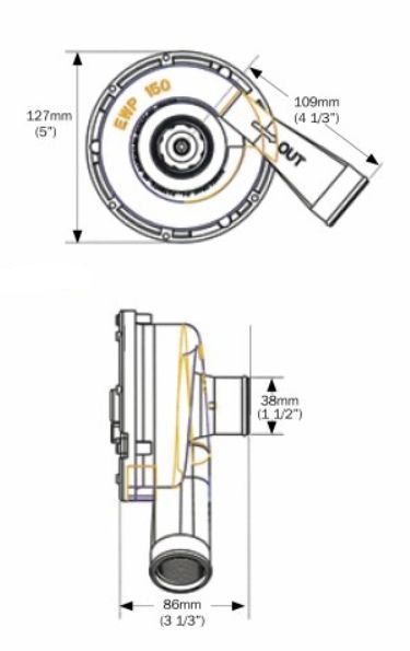 | Pump design: Clockwise Centrifugal Pump Material: Aluminum Pump Finish: Natural Flow Rate at 12 Volts: 150 L/pm Operating Voltage: 3V DC to 15V DC Maximum curren 10A Operating temp: -40 to 130C (-40 to 266F) Burst pressure: 500 kPa (72.5 psi) Dimensions: 128mm x 85mm x 188mm Hose Sizes: 38mm to 51mm (1-1/2" to 2") Inlet & Outle Internal Thread AN-16 Weigh 1,170 grams (2.60lbs) Quantity: Sold as a kit. |