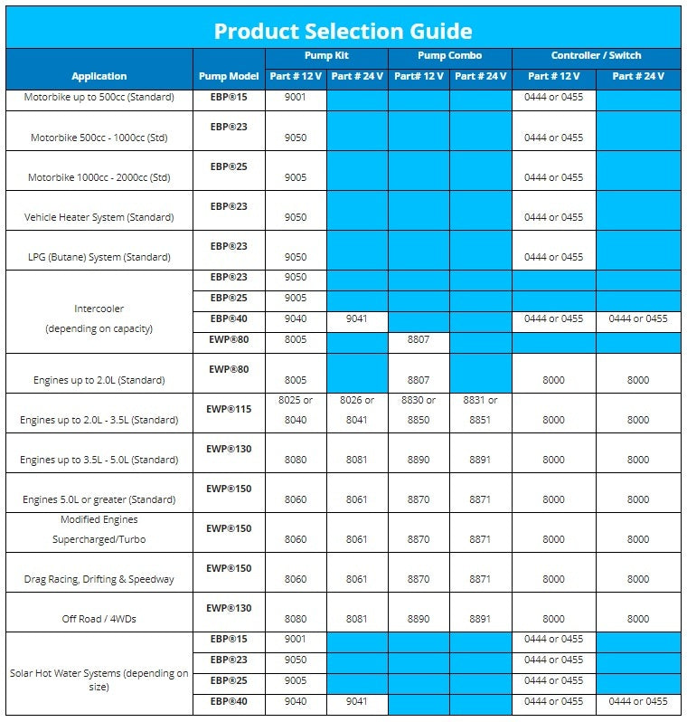 The EBP motor has no brushes to ever wear out and the pump is magnetically driven by the motor, which means that no shaft sealing is required. The many EBP applications include: booster for car heater and LPG systems, solar pump applications, water cooled motorcycle, go-kart engines, turbo air / water intercoolers & household irrigation.