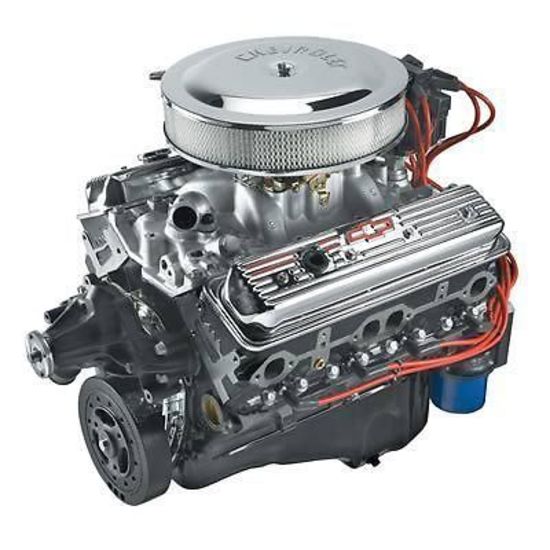 Aluminum dual plane with EGR capability Vortec style intake manifold with a Holley 600 cfm vacuum secondary with electric choke help feed the engines. Spark plugs, HEI distributors are included. Cast iron long style water pumps with standard "V" belt rotation threaded for 1979-89 power steering pump brackets. Standard 8 in. balancer and 12 3/4 in. flexplates, along with chrome air cleaner, and standard cast aluminum thermostat housings with driver side hose connection and a 180 degree thermostat.