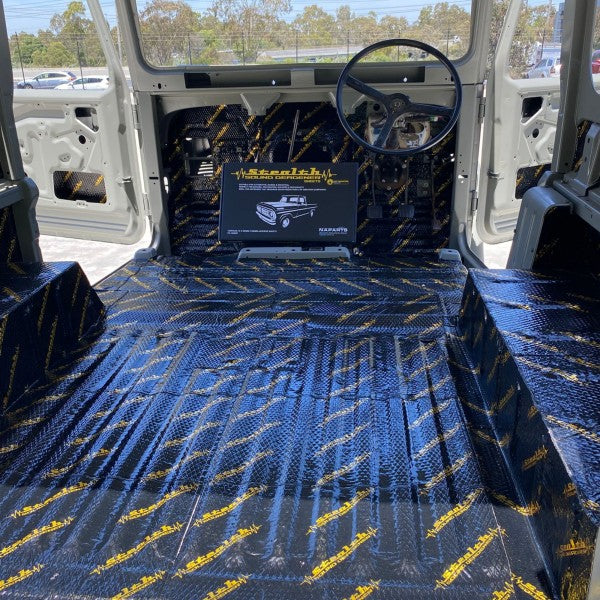 Heat Protection Products Stealth Sound Deadener reduces vibration, road noise, and improves acoustic performance inside the cabin. The adhesive Butyl sheets mould easily into place on most hard surfaces. Once the stealth Sound Deadener is in place, it is recommended using Heat Protection Products Foil Tape for the edges and stealth Matt as the underlay which will reduce heat and noise further, then it's time for the carpet/vinyl.