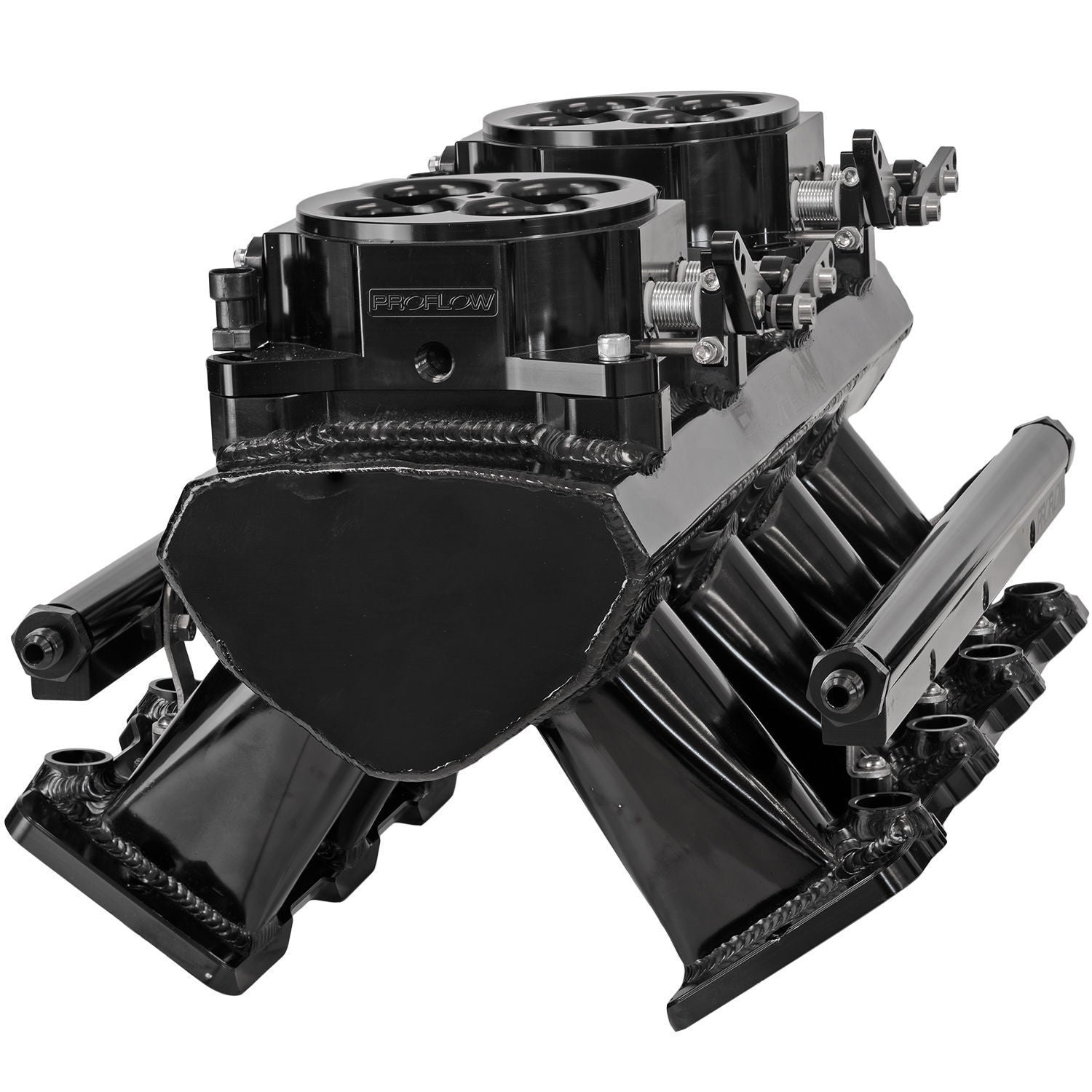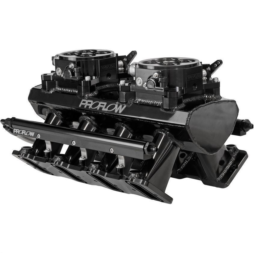 This manifold allows you to use 2 x 4150 or 4500 quad throttle bodies and has 4 vacuum ports. Manifold is supplied with o-rings and bolts. Fuel rail PFEM62219 and throttle bodies PFEQTB1000B are not included and are available separately.