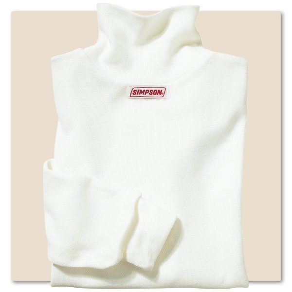 SIMPSON LONG SLEEVE UNDERWEAR TOP NOMEX SFI3.3 MEDIUM WHITE SI20500MSimpson soft knit Nomex underwear shirts keep you comfortable and protected. Their shirts have a full-length bottom to stay put and are available in SFI-approved short-sleeved crew neck styles and FIA-approved long-sleeved mock turtleneck styles. Dress for racing with Simpson soft knit Nomex underwear shirts. Specs:Fire Retardant Underwear Shirt Style: Long sleeve turtle neck Fire Retardant Underwear Shirt Size: Men's Medium