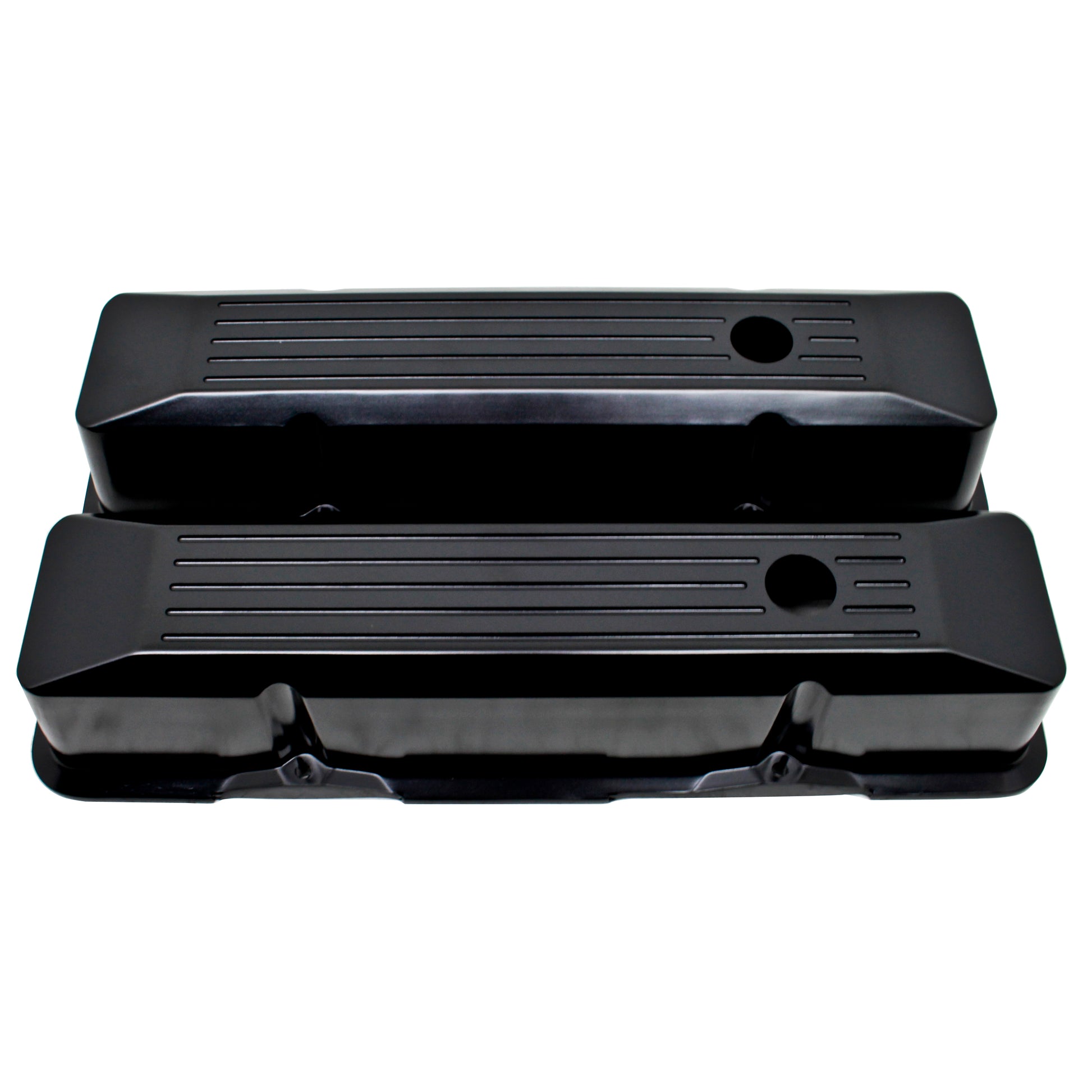1958-86 Chevy small block recessed ball milled black aluminum valve covers. There is one 1.25? push-in style hole in each cover. Fits 1958-1986 Chevy 283-305-327-350-400 small block engines, and 1987-95 Pontiac/Camaro/Firebird 350 engines. Tall style. Height: 3-11/16".