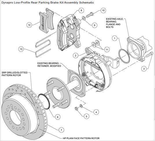 For popular musclecar rear axle applications needing a parking brake assembly and some extra clearance, Wilwood DynaPro low-profile rear parking disc brake kits provide the solution. Forged billet DynaPro low-profile 4-piston calipers, 11 in. one-piece hat and rotor assemblies, and high-friction pads provide optimal balanced braking for your performance street/strip and show machines. Choose either solid-surface or cross-drilled and slotted rotors to personalize your style and optimize brake performance. These Wilwood brake kits also feature a neatly hidden internal shoe system for a clean installation and superior static holding power for parking. Get bolt-on performance and looks for competition or show with Wilwood Dynapro low-profile rear parking disc brake kits.