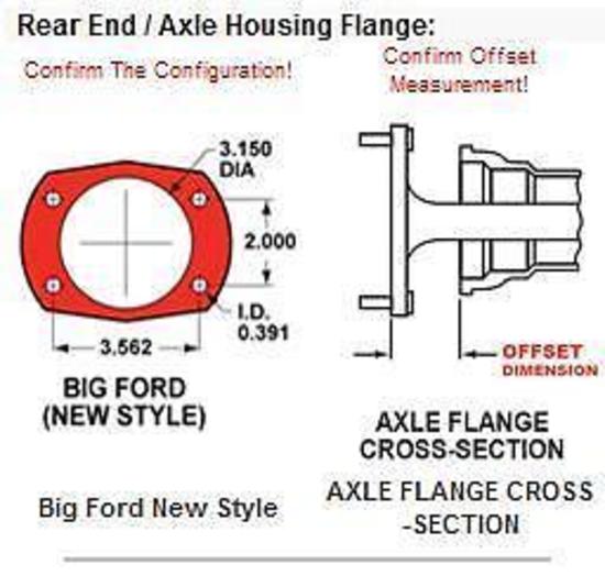 Application: Ford 9" Big Ford new style housing end measures, 3.562 in. top bolts center to center, 3.562 in. botom bolts center to center and 2.000 in. top to bottom bolts center to center.