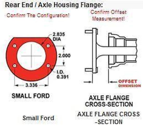 Application: Ford 8", Ford 9", Small Ford housing end measures, 3.336 in. top bolts center to center, 3.336 in. bottom bolts center to center and 2.000 in. top to bottom bolts center to center.